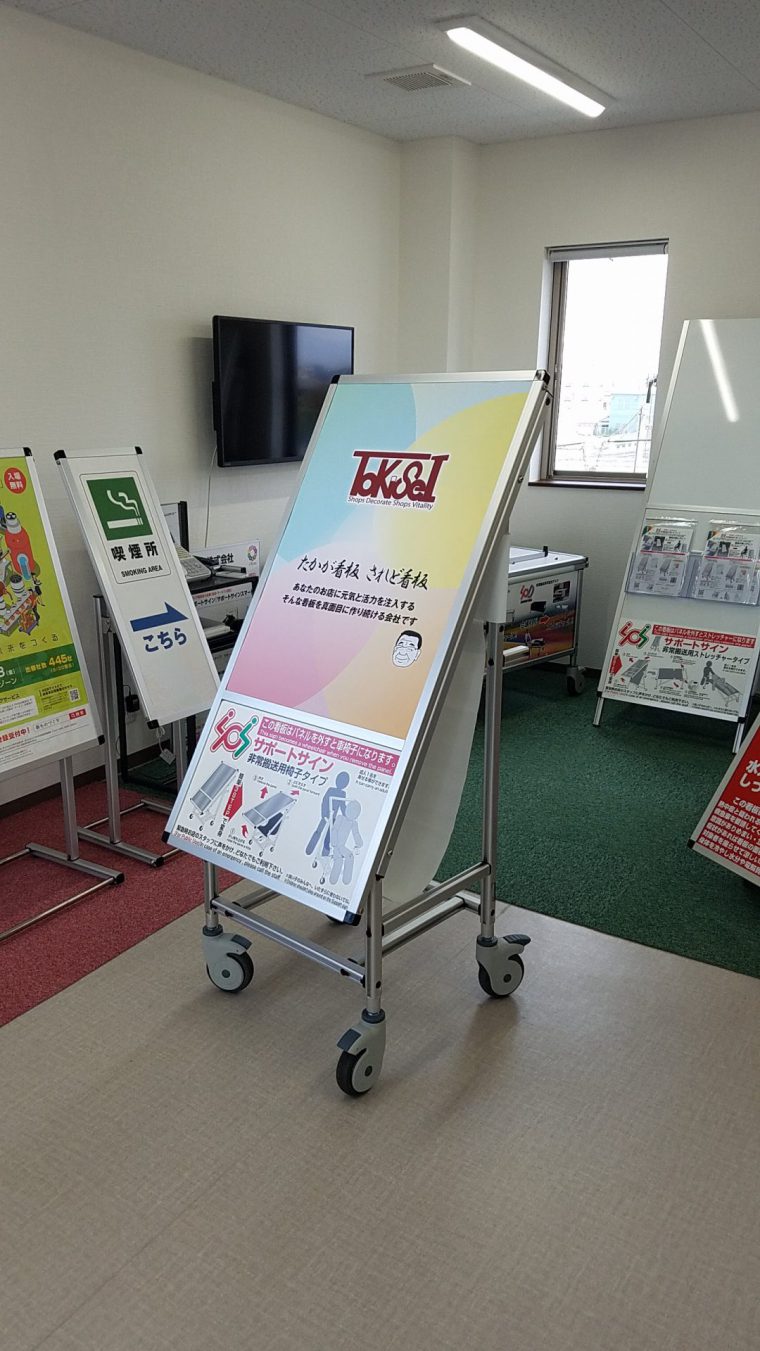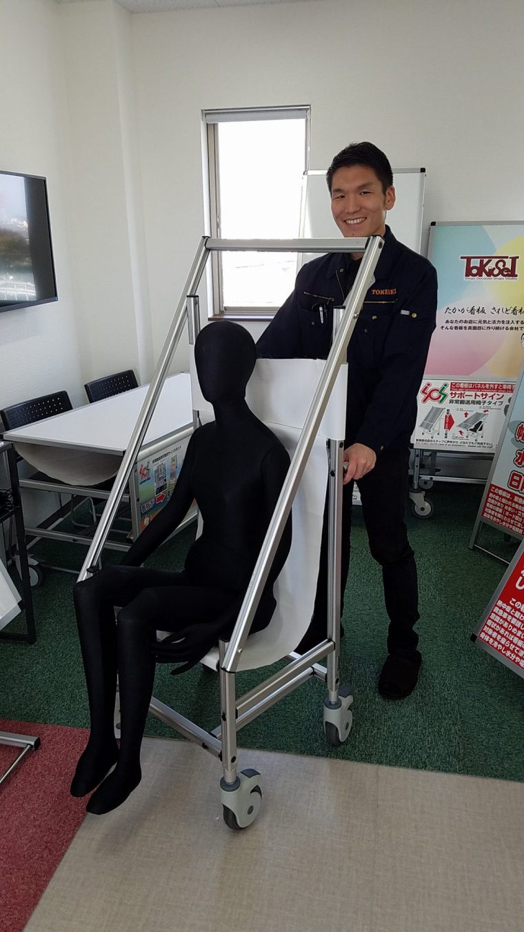 このほど新しく開発されたた非常搬送用可変式サインスタンド『サポートサイン』は平成29年度「大阪府中小企業新商品購入制度」に認定されています。非常時には担架になったり車いすになったりと形を変える優れものです。